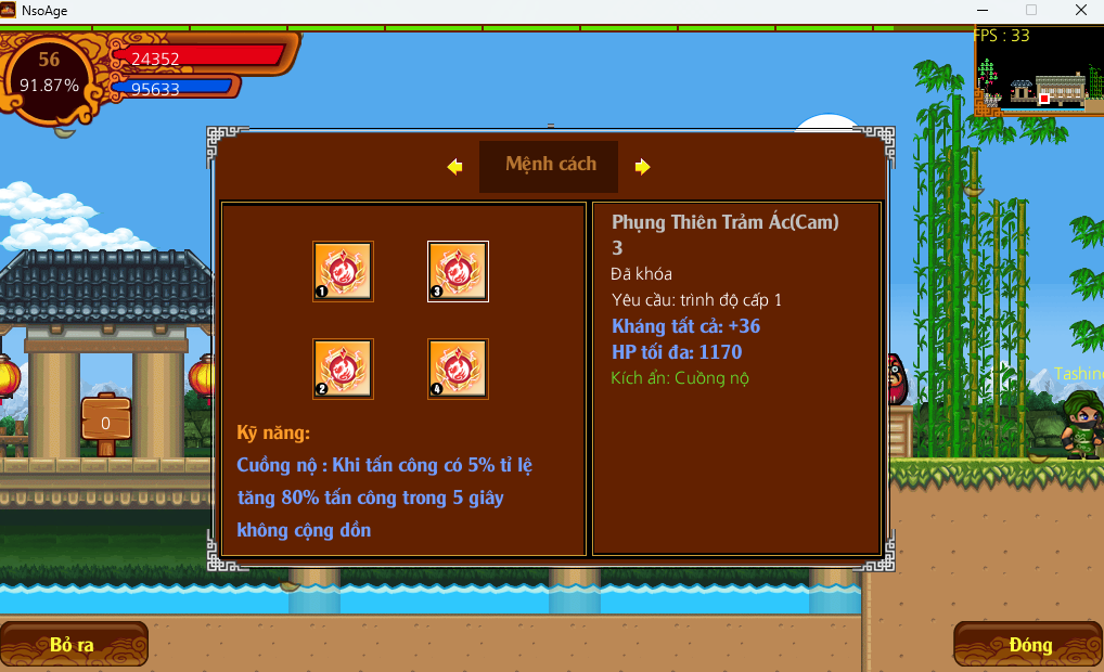 Nộ : Tăng x1.5 tấn công và kháng trong 10 giây. Tỉ lệ xuất hiện 30%, hồi chiêu 60 giây