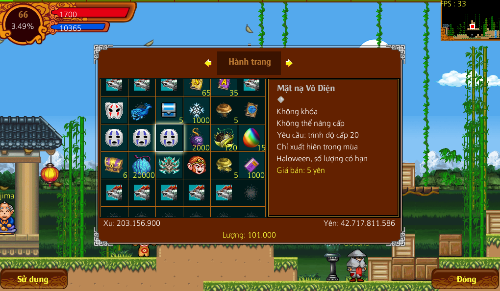 - 2 triệu : Mặt nạ Tôn hành giả vĩnh viễn + Nấm linh chi vạn năm x5 + Sách bí thuật Cấp A x10 + Rương hoàn mỹ x1